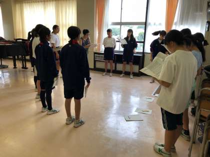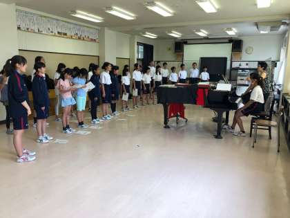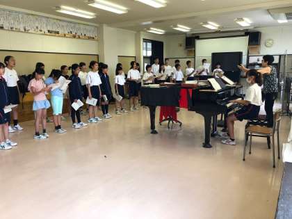 合唱部の「学び舎小学校部活動体験」は、今週21日(火)から今日まで行っていましたが、今日がいよいよ最終日です。今日は6人の小学生が参加していました。楽譜を渡されて、時々梅中生からアドバイスをもらいながら、パート練習から全体の合わせ練習まで、一緒に楽しそうに歌っていました。