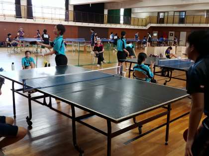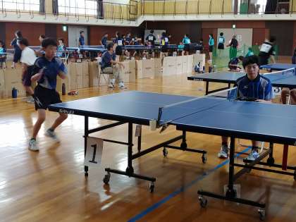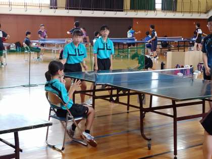 卓球部の練習試合では、顧問の先生やコーチが見守る中で、