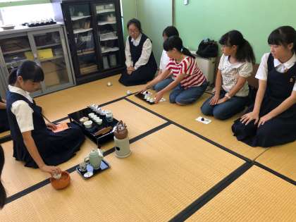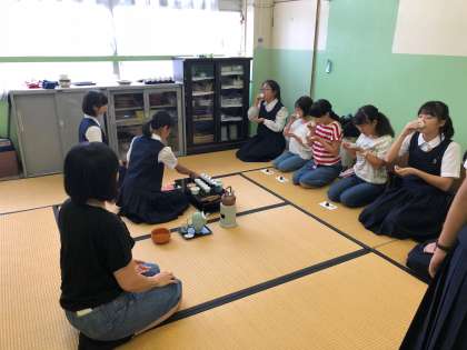 今日は、煎茶道部の部活動体験に3人の小学生が参加しています。特設の和室に正座し、梅中生の所作を見ながら煎茶のいただき方を学んでいました。
