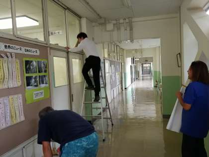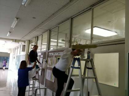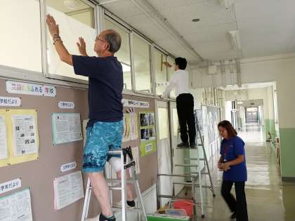 学校主事さんが職員室と校長室の窓清掃と日差し除け貼りをしてくださっています。