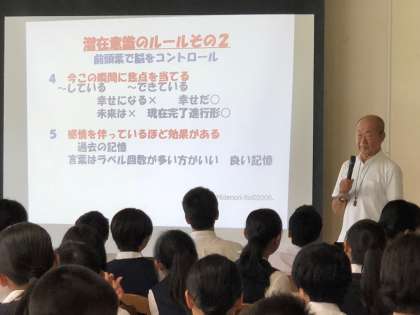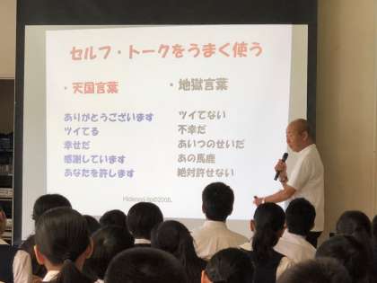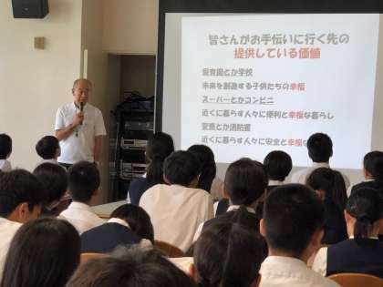 10日からの職業体験を前に、今日はいつも企業などで「働くこと」について講演をなさっている方にご来校いただき、お話を伺いました。働くために必要な心構えや、「幸せに過ごすために必要なこと」についてユーモアを交えながらお話くださいました。