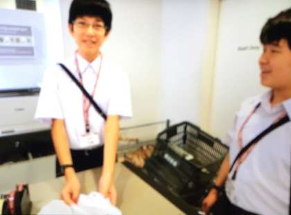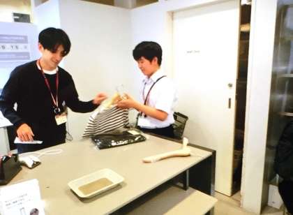 事業所の方から、大切なポイントを教わりながら仕事を体験していました。ハンガーの通し方、商品の開封の仕方、商品の手渡し方など、どれも、商品の品質やお客様のことを考えたものでした。
