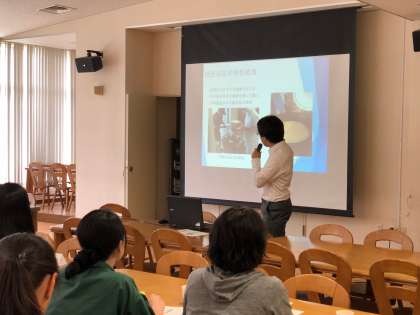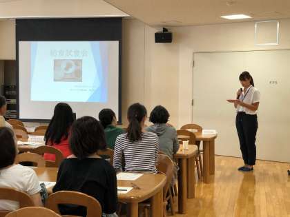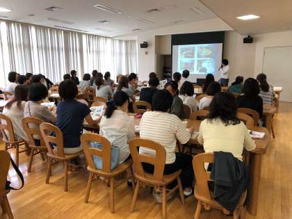 今年度第2回家庭教育学級は、給食試食会です。給食をいただく前に、いつも給食に関わっていただいている管理栄養士の先生に、給食についてのお話をしていただきました。