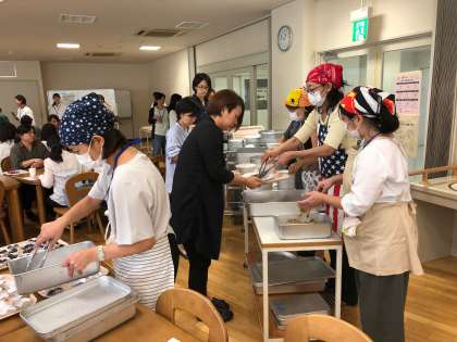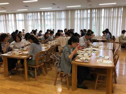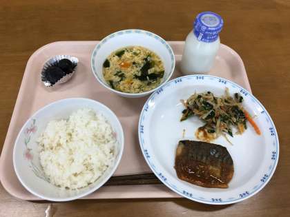 今日の給食のメニューは、ご飯、かきたま汁、サバの味噌煮、野菜のごまあえ、ぶどうです。なかなか普段給食を食する機会がないPTAの皆さんは、なんだか懐かしそうなで楽しそうです。
