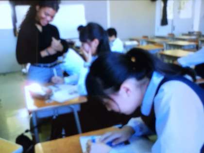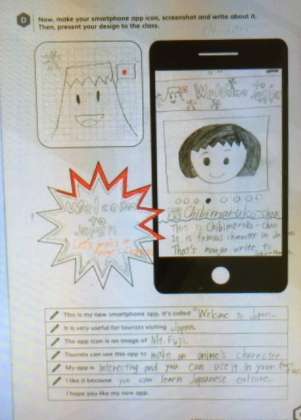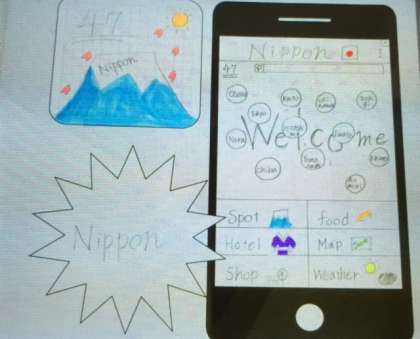 生徒同士が話し合ったり、質問したりしながらスマートフォンアプリをデザインし、説明文を完成させました。