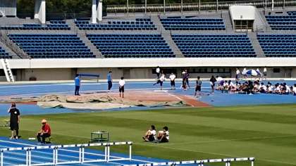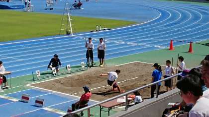 走り幅跳びと砲丸投げの様子です。強い日差しの中、頑張っています!