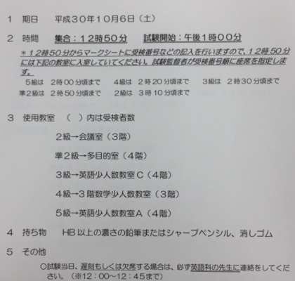 明日、10/6(土)は校内で英検を申込みした生徒の検定日です。
