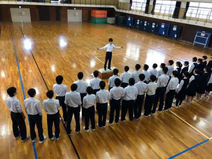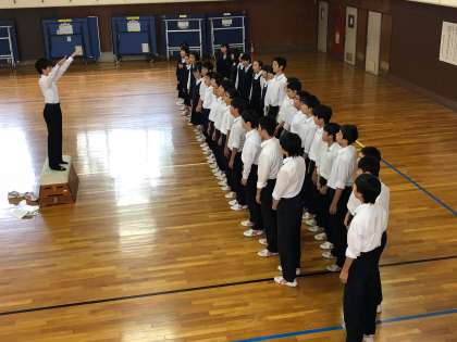 3年B組は格技室で最後の練習をしています。格技室は、歌声がとても響くので、歌声が格技室いっぱいに広がります。細かい部分の調整を行いながら、みんなで気持ちを高めながら練習に取り組んでいました。
