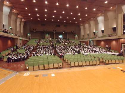 PTAの役員の方々も受付準備をしてくださっています。生徒たちが入場してきました。いよいよ開会です。