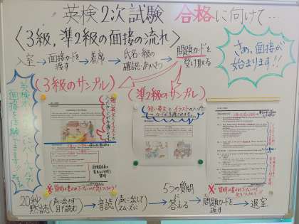 2階の階段の踊り場に、英検の2次試験対策が書かれたホワイトボードがあります。