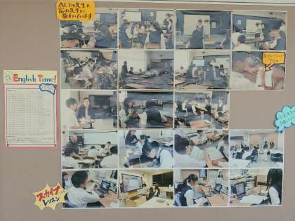 4階の英語少人数教室の前に、金曜日の放課後に行っている「English Time」の様子が掲示されています。活動している生徒たちの振り返りにもなり、次年度、学習する1年生への啓発にもなっています。