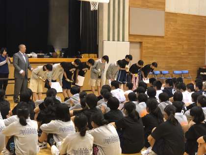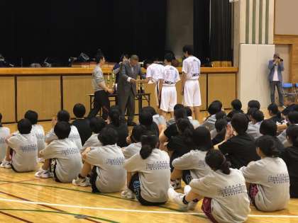 表彰式です。バスケット担当校長の梅中の校長先生から、男女共に表彰されました。おめでとうございます。