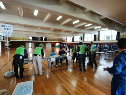 本日は避難所運営訓練の日です。避難所運営委員の方々が受付の準備をしています。本校の2年生も防災教育の一環で参加します。