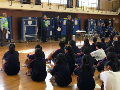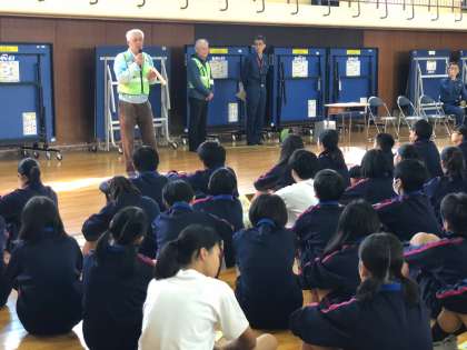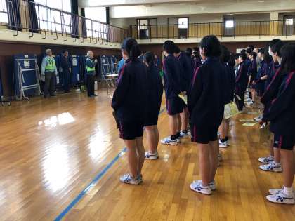 受付訓練を終えて、開会式を行なっています。自治会長さんや、校長先生、地域の防災担当の方から、今日の訓練についての心構えなどのお話がありました。