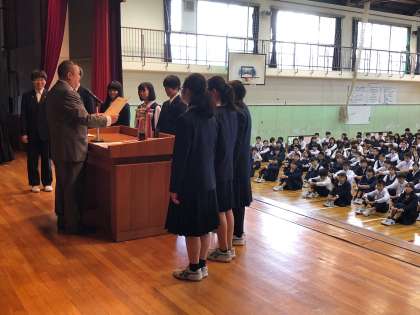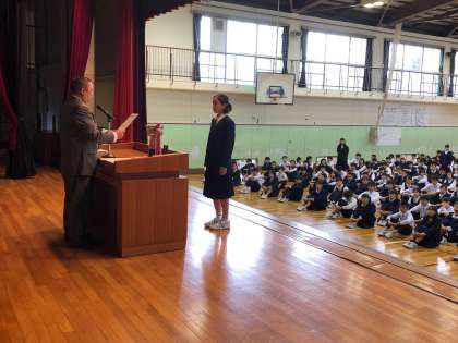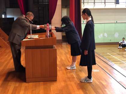 卓球部(世田谷区中学校新人卓球大会・シングルス中1の部)で2位になった生徒、世田谷区立中学校演劇発表会に出演し、見事な演技を見せてくれた演劇部、校内ビブリオ大会を経て、11月10日に行われた世田谷区ビブリオ大会に学校代表として出場した生徒の表彰の様子です。