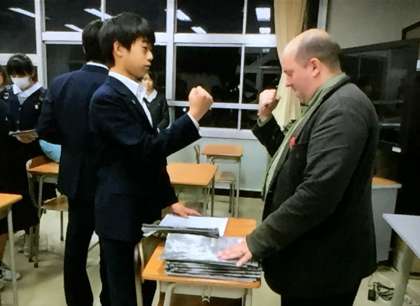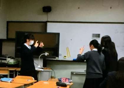 最後に、ALTの先生に自分の作ったオリジナルのジェスチャーを披露し、込められた意味など説明していました。