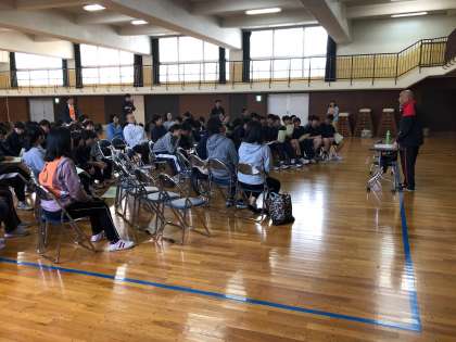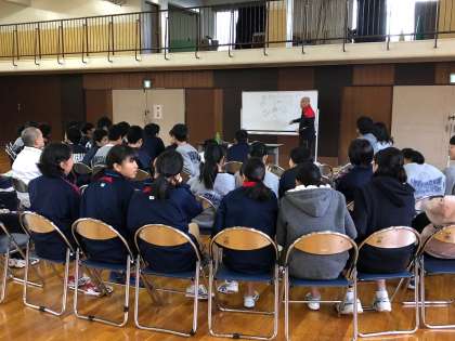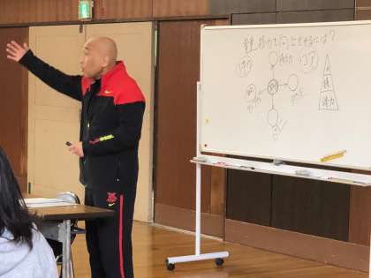 まずは、講義です。競技力を上げるには、持久力、スピード、パワー、アジリティが必要で、それには筋力アップが必須、そのために体幹を鍛える必要があるというお話がありました。