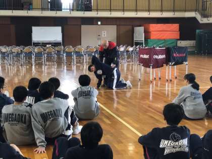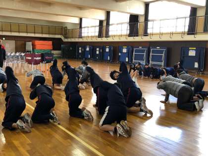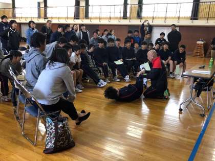 実技が始まりました。股関節の柔らかさの重要性のお話の後、背骨を伸ばしたりねじったりする運動です。
