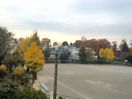 銀杏の木が存在感をみせる早朝の校庭に、落ち葉掃きボランティアの生徒たちが竹ぼうきや熊手をもって颯爽と歩いてきました!