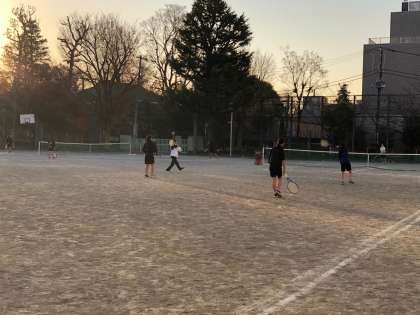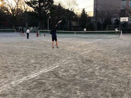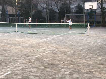 まだ太陽が高く上がりきっていない早朝、きりっとした空気の中、テニス部の女子が元気に朝練習をしています。「ナイスショット!」という声が飛び交う中、生徒たちは真剣にボールを追っています。