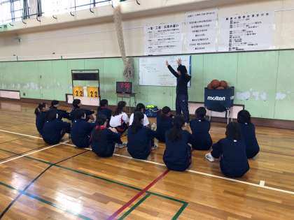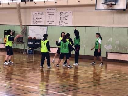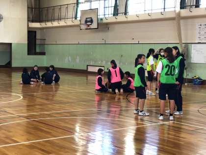 1年生の保健体育の授業では、バスケットボールに取り組んでいます。今日の目標は、ボールをもっている時ボールを見ない、ディフェンスの時に手をあげる、です。授業の始めには目標の確認を行い、ゲームに入る前にはチームで作戦会議をして臨みます。さあ、作戦会議で打ち合わせたようにプレーできるでしょうか。生徒たちは、頑張ってプレーしています。