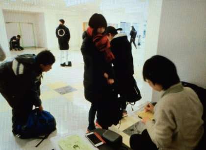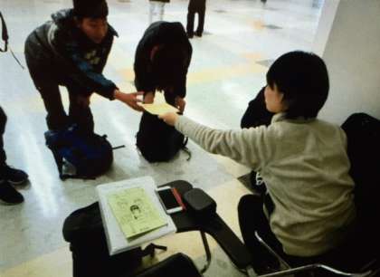 科学技術館です。各班が続々と到着し、チェックを受けています。9つの班が到着しました。