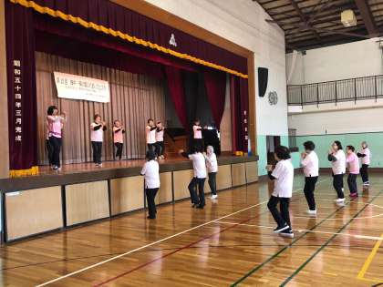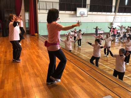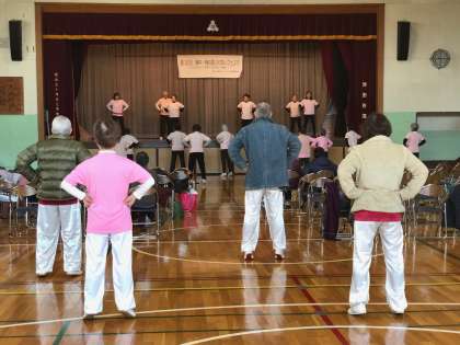 トリム体操クラブは、会場の皆さんも一緒なっての簡単有酸素運動を披露しています。「おーシャンゼリゼ」などの聞き慣れた音楽に合わせて、健康体操を進めていきます。