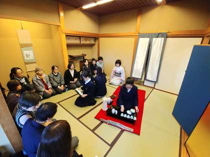 あいにくの天候で、野点は中止になりましたが、星辰堂和室で茶机椀手前が行われています。
