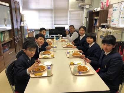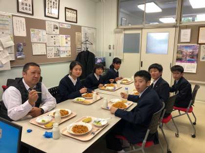 今日は、昨日1年生のレクで1番になった生徒の班が、そのご褒美として(?)校長室で校長先生と副校長先生と一緒に給食を食べました。最初は緊張していた様子の生徒たちでしたが、次第に会話も弾み、楽しいランチタイムを過ごしました、ちなみに今日の給食のメインディッシュは、スパゲティナポリタンでした。