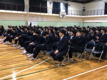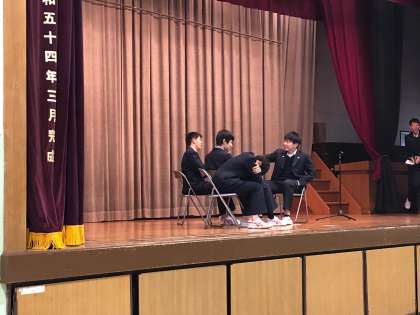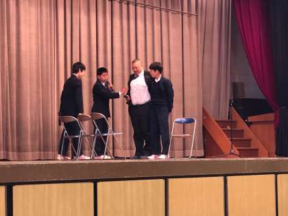 「人生相談」と題した漫談です。会場を笑いの渦に巻き込んでいます。校長先生のお悩み相談にも明るく答えていました。