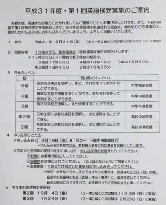 本日4/12(金)に第1回英語検定のお知らせを配布しました。
