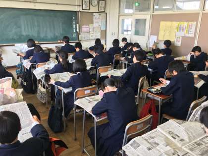 2年生表現の授業では、全員が新聞を読み自分の考えをまとめる作業をしています。