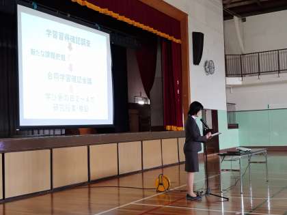 梅丘中学校の学び舎主任の先生が、学校協議会や学び舎の取組について紹介しました。