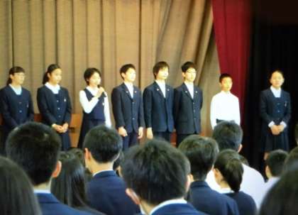 前期の各委員会の委員長が体育館のステージにあがり、全校生徒に向けた挨拶と活動への協力の呼びかけをしました。