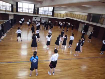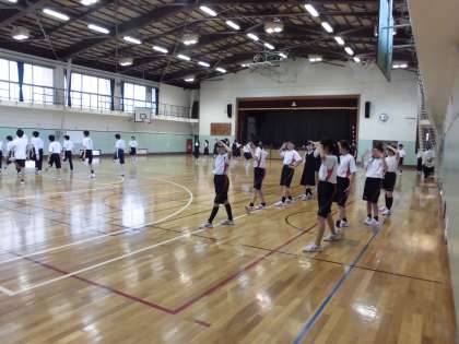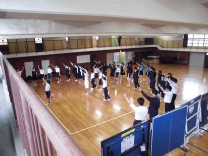 今日から1年生の応援団が加わり、3年応援団が優しく熱心に教えています。細かい動きが多い振りは覚えるのに大変そうですが、一度教えてもらうとすぐに覚え、先輩たちについていこうとします。先生たちは一切口出しはしていませんが、先輩が後輩をしっかりと指導してくれています。梅中の良き伝統が引き継がれる瞬間です。