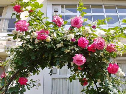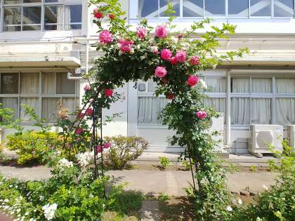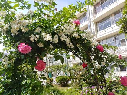 中庭にあるアーチがきれいな花で飾られています。