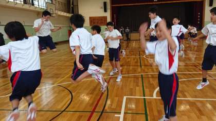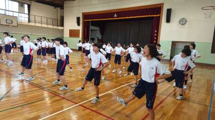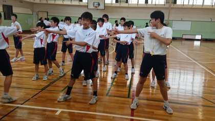 体育館で黄色団の3A,2A,1A,1Dが練習しています。3年生が1,2年生に丁寧に指導しています。