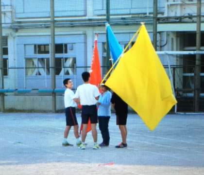 昨日の放課後に体育委員長と団長が校庭でエール交換の練習をしていました。