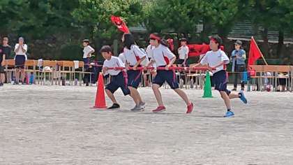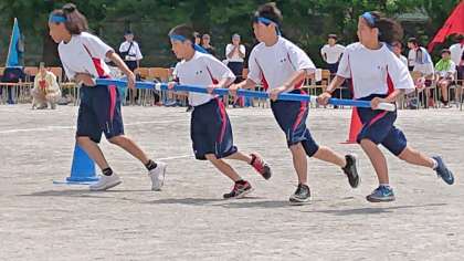 1学年種目(台風の目)です!4人で棒をもってリレー形式でコーンを周ります。(副校長)