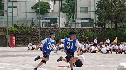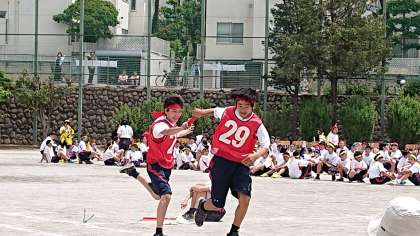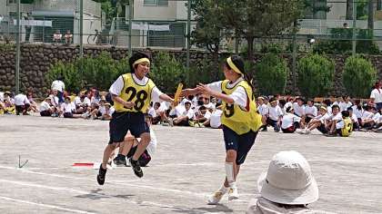1年全員リレー、しっかりとバトンタッチ、インコースを走るのがこつです