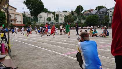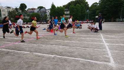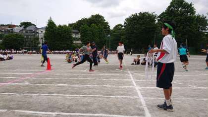 部活動対抗レースが始まりした。部活のユニホームに身を包み,道具をもって走っています。(副校長)