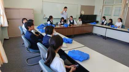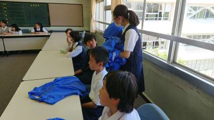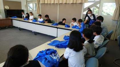青のウインドブレイカーが手渡され、注意事項の説明を受けます。母校への訪問先として失礼のないようにボランティアをつとめてきてください。(副校長)
