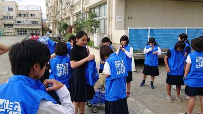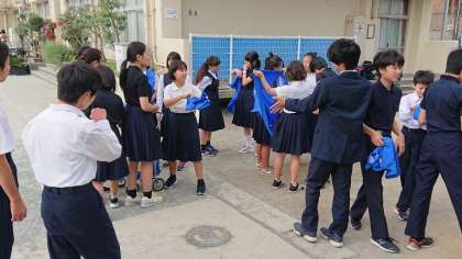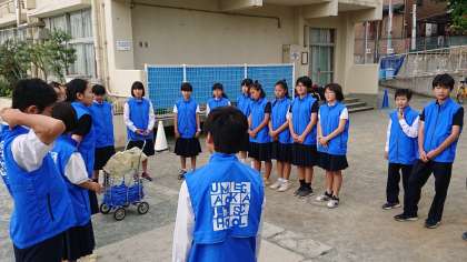 生徒会とボランティア生徒の合計23名で参加させていただきました。小学生の大きな声に負けないように「おはようございます!」と声かけをすると元気な声が返ってきました。(副校長)