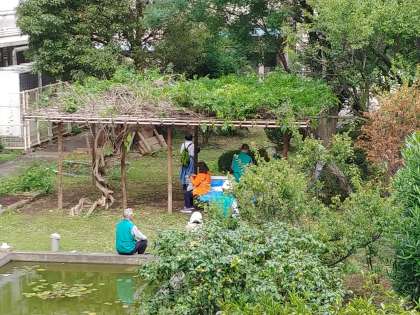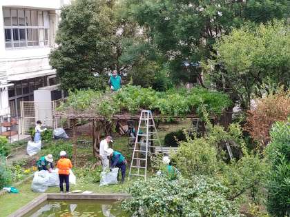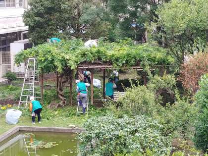 本日、中庭にある藤棚の剪定をボランティアの方々が剪定してくださいました。