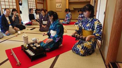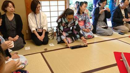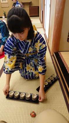 最初にお茶を一杯いただいて、その後に、お菓子を何回かに分けていただいて、最後にすこし苦めのお茶がでてきます。お茶やお菓子を手にするまえやあとには、「頂戴します」「有難うございます」の挨拶を畳に両手をついてしました。(副校長)