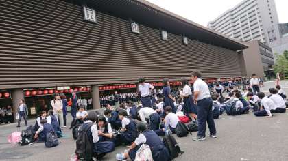 半蔵門駅に到着しました。遅れてしまった2つの班をまって国立劇場前の集合場所へ。出席92名欠席4名で鑑賞します。(副校長)