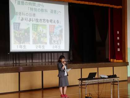 本校の道徳教育推進リーダーの先生が「特別の教科 道徳」について講演を行いました。さらに、世田谷区教育委員会の指導主事の先生から講評をいただきました。