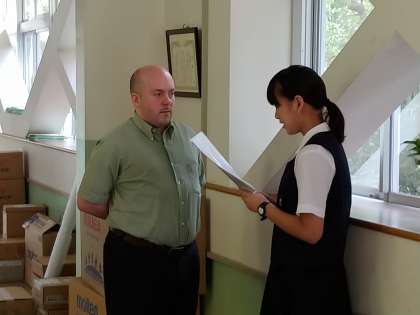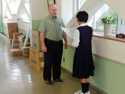 職員室前では、生徒がALTの先生に英語の音読を聴いてもらっていました。