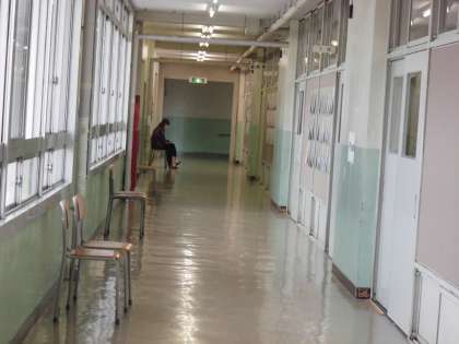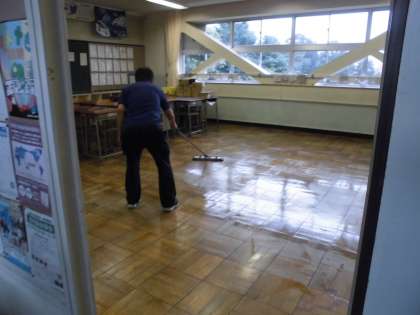 面談がない時間を見計らって、主事さんたちが教室の床にワックスをかけてピカピカにしてくださっています。さすがプロの技です。