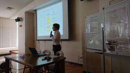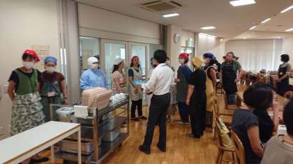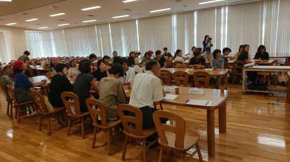 今回は「給食試食会」です。PTA主催で52名の保護者の方に参加していただきました。 本校栄養士の豊島より、給食の本校での考え方、安全性、栄養バランス、1日の流れ、献立表の作成について説明していただきました。